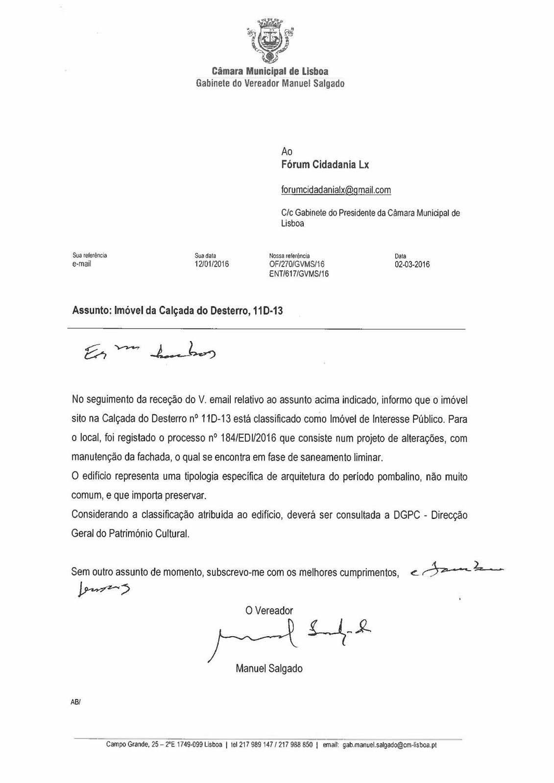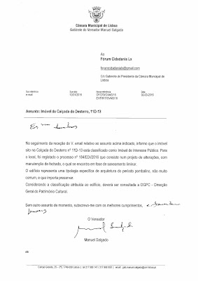 Serve o presente para alertarmos V. Exa. para alguns detalhes significativos referentes à demolição pré-anunciada para o edifício pré-pombalino da Rua do Meio à Lapa, nº 12-14, a saber: