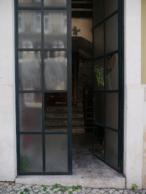 Apenas parecem sobreviver os azulejos do Mestre Querubim Lapa nas fachadas exteriores e alguns dos paineis no interior; tudo o resto, o mobiliário, revestimentos de tectos, chão e paredes foi arrancado e partido como se fosse apenas lixo. O projecto desta loja é do Arquitecto Conceição Silva que desenhou todo o equipamento, desde a iluminação, balcões, móveis numa notável colaboração com o ceramista em 1962. Lamentável que tudo tenha sido arrancado de forma descuidada pelo que se pode observar através de um buraco numa das portas. Será que os paineis de azulejo de Querubim Lapa no interior foram danificados? Vamos perguntar ao PISAL, CML. Os vidros das grandes montras foram pintados de branco talvez para não permitir a visão do vandalismo já realizado no interior. Lisboa está assim...