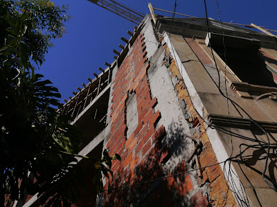 Escadinhas da Porta do Carro, junto do Hospital de S. Lázaro (Freguesia de Santa Maria Maior) - aqui existiu um antigo imóvel, de r/c e 1º andar apenas, do género do prédio amarelo ao lado. Era um imóvel municipal e foi vendido no âmbito do Programa "Reabilita Primeiro e Paga Depois". Mas o que se passou depois é bem emblemático da direcção que a CML está a dar à "reabilitação urbana". O imóvel foi totalmente demolido, e em seu lugar está a ser construída uma nova construção com 4 pisos. Calculamos que no final da obra, também esta vai ser classificada como "reabilitação" e assim contribuir para as estatísticas cor-de-rosa que nos tentam enfiar pela goela abaixo. Mas só os cidadãos ainda pouco informados engolem estas descaradas construções novas como reabilitação. Isto é simplesmente fazer batota, isto é andar para trás. Isto é Fraude na Cidade.